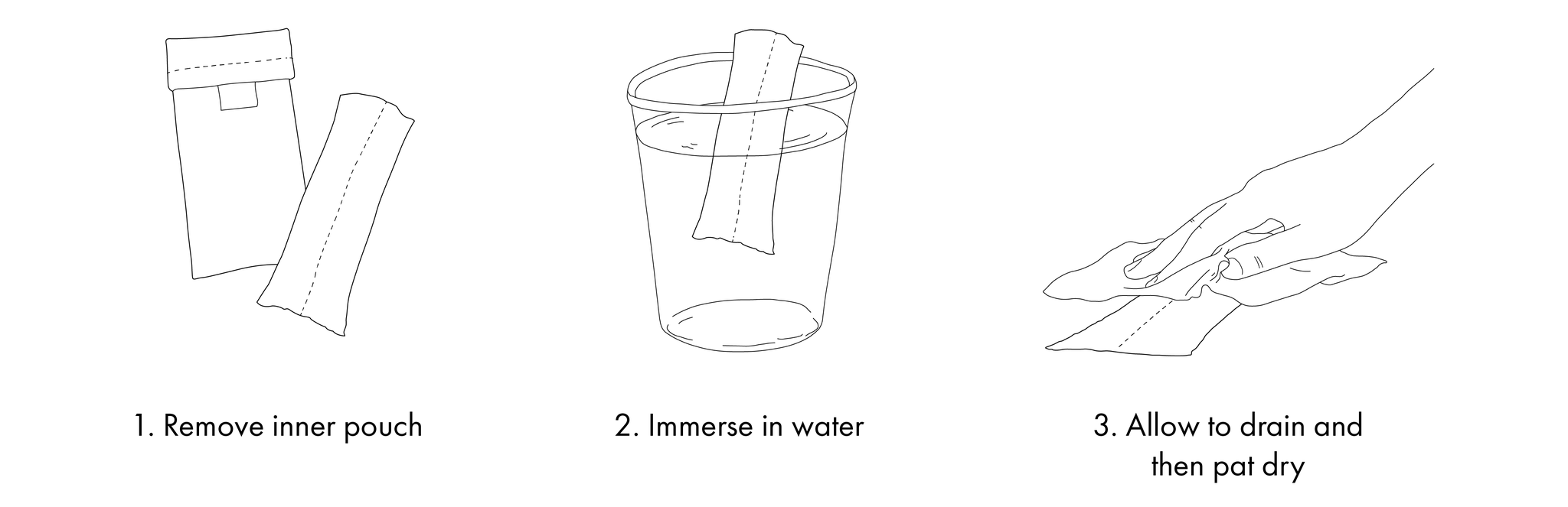 1. Immerse the inner pouch containing the crystals in cold water to soak the Glucology® Cooler Pouch for between 5 and 12 minutes (depending on size). Check product brochure for exact time.